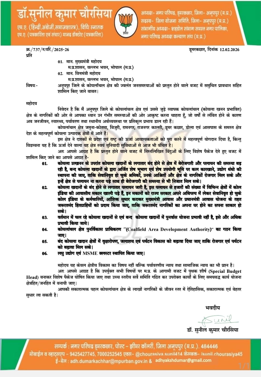 प्रस्तुत होने वाले बजट में मिले विशेष पैकेजजनहित मे मुख्यमंत्री को किया पत्राचार